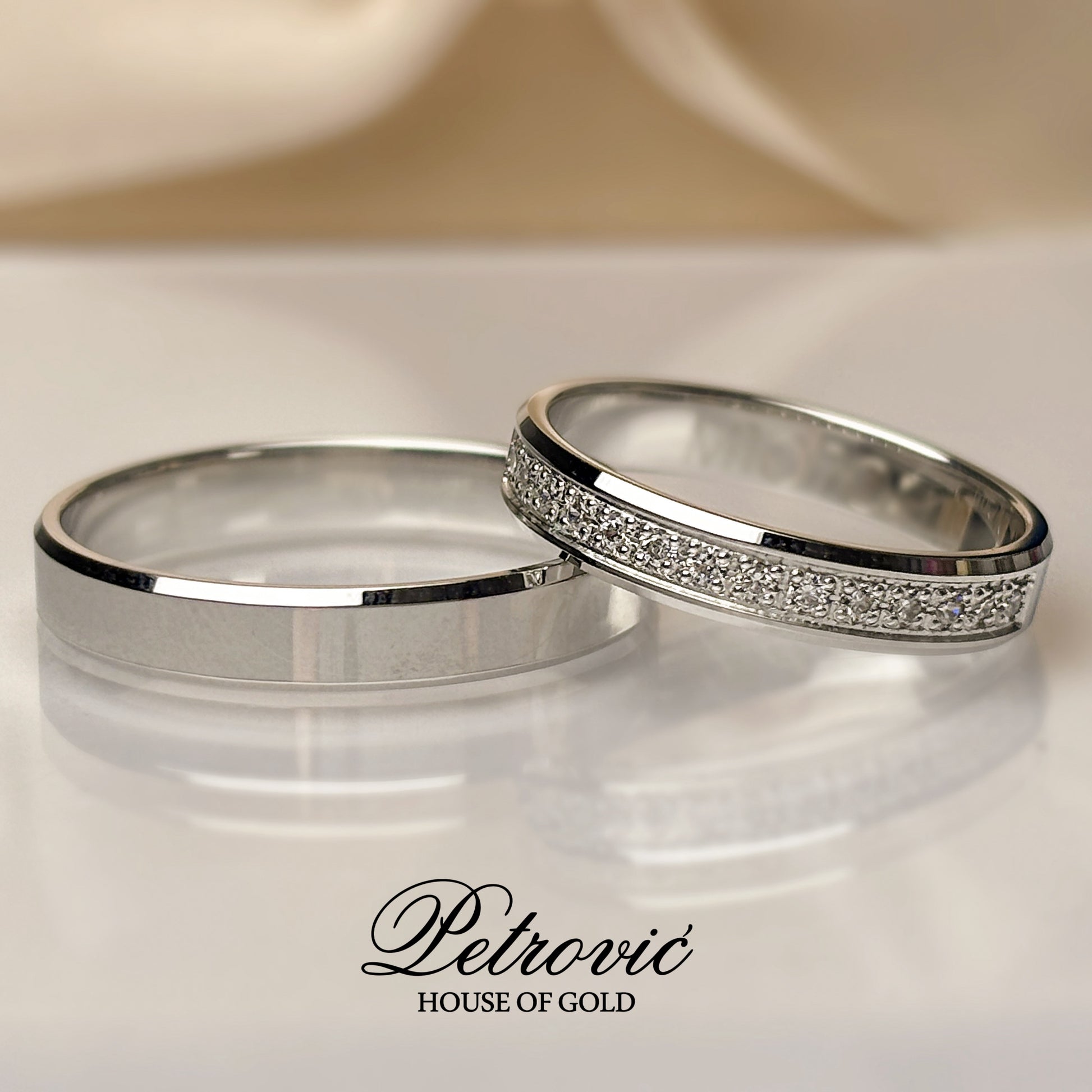 Ovaj par burmi kombinuje savremeni dizajn i praktičnost. Oborene ivice koje krase burme pružaju udobnost, dok kristali na ženskoj burmi daju suptilan sjaj. Idealno za parove koji žele elegantan i bezvremenski izgled.